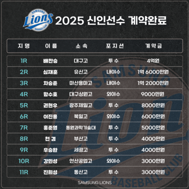 삼성라이온즈 2025 신인투수 배찬승 계약금 4억 및 심재훈 차승준에 대한 이야기들을 간략하게 담아보려고 합니다. 삼성 라이온즈는 이번 2025 KBO 신인드래프트에서 상당히 좋은 픽을 했다는 평가를 받았는데 삼찬승을 비롯하여 심재훈 차승준등 좋은 선수들이 있습니다