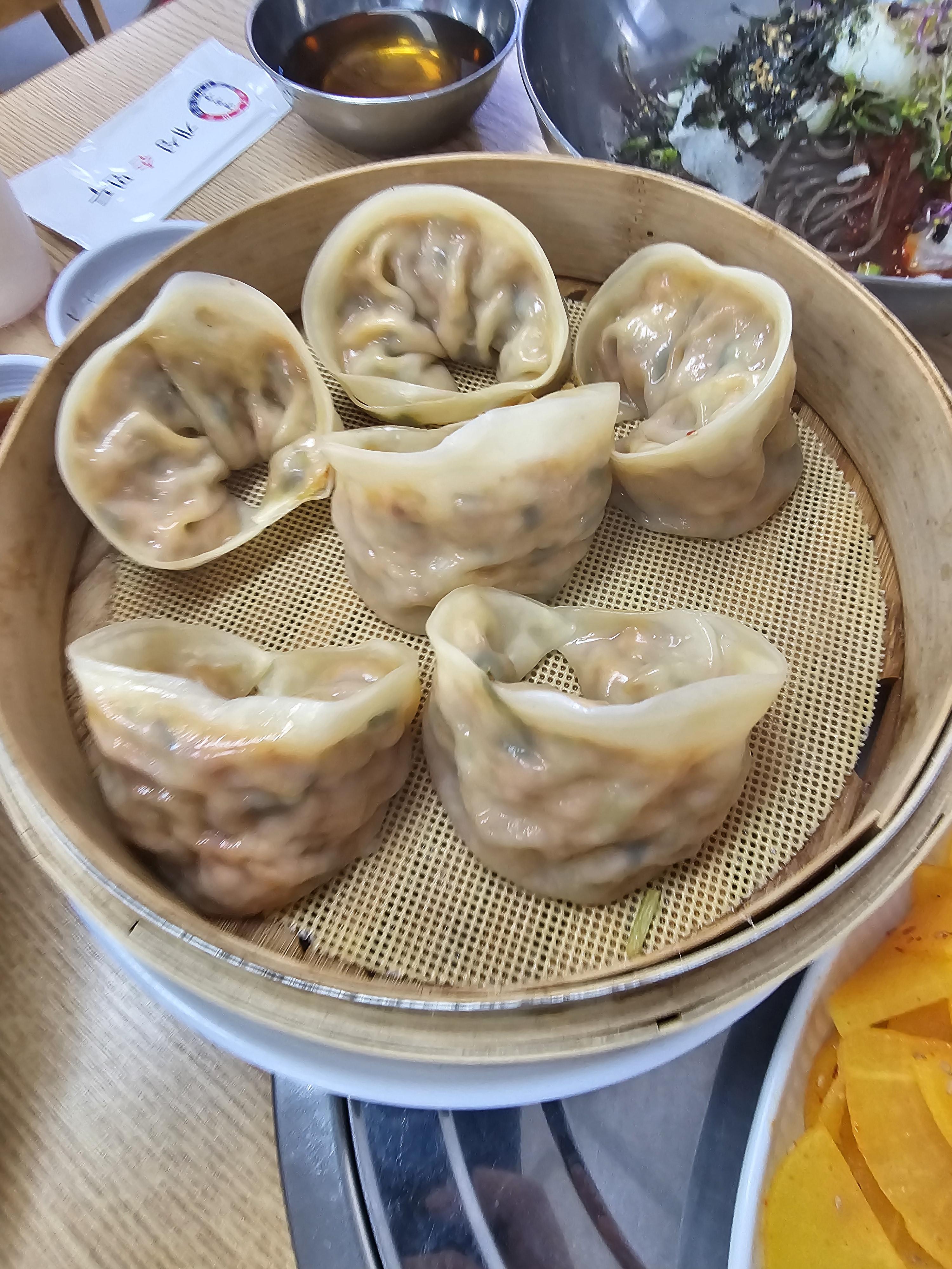 마지막은 찐만두와 함께 ㅎㅎ 고기만두도 맛있지만 감칠맛이 더해진 김치만두가 더 맛있기도 합니다. 원래 전골로 먹어도 맛있는데 시원하게 냉모밀과 찐만두 조합도 상당히 괜찮더라구요.