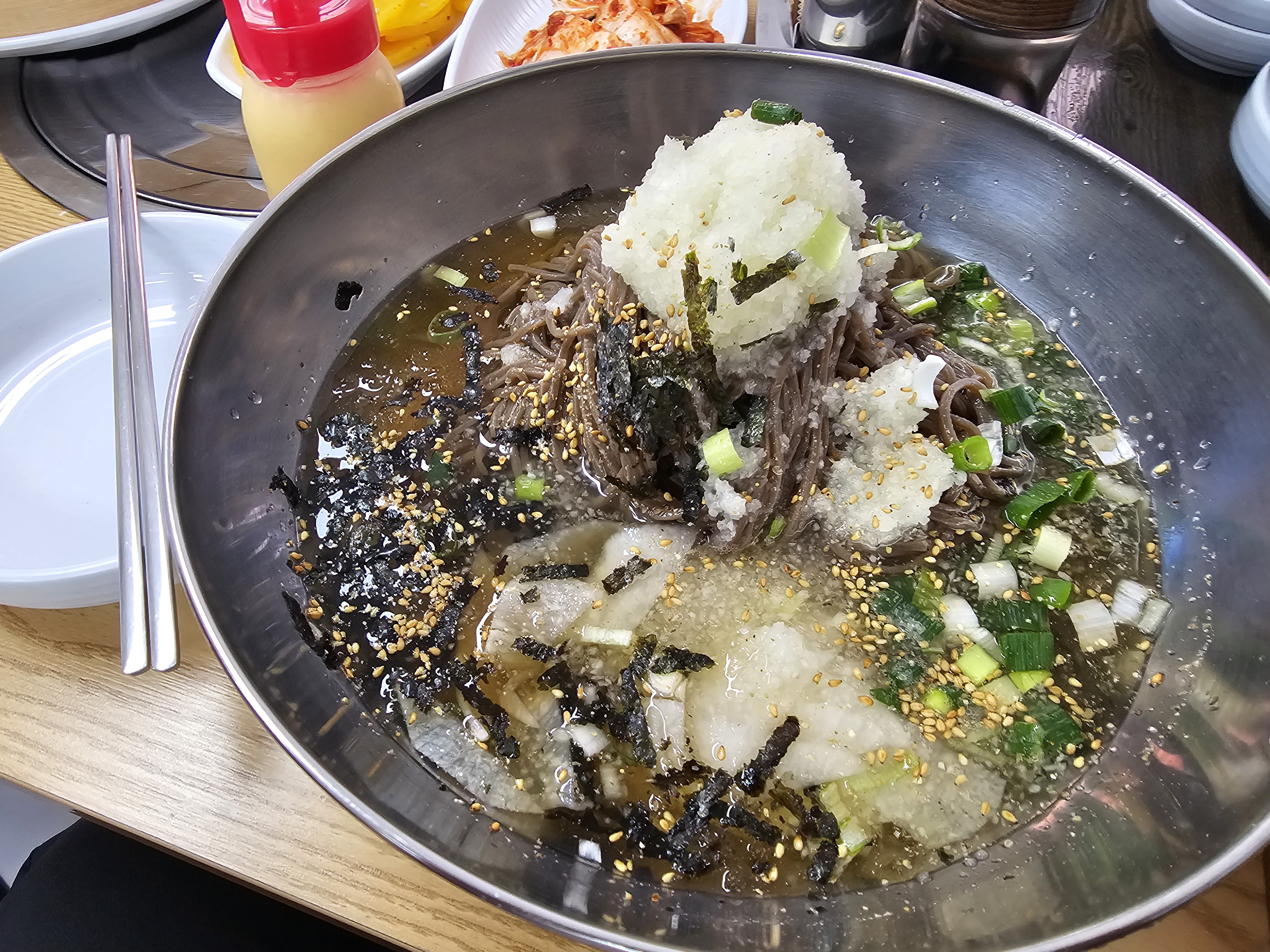 엄청난 맛집은 아니지만 그래도 여름별미로 얼음동동 띄운 육수에 시원함 가득한 양념과 전반적으로 깔끔하게 먹기 좋은 냉모밀입니다. 일본식처럼 담궜다가 먹는 방식이라기보다는 냉면같이 그냥 시원한 육수에 말아서 먹는 스타일이에요.