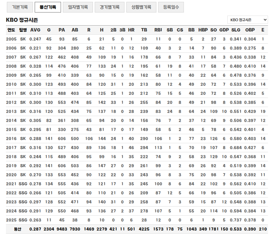 통산기록만 보더라도 2300경기 이상의 경기를 치뤄냈고 501홈런을 기록하고 있으며 5할이상의 장타율 그리고 OPS형의 타자로 확실한 레전설의 기록들을 만들어가고 있는데요. 여튼 KBO를 대표하는 타자 그리고 나이가 들어서도 여전히 3루수 위치에서 수비까지도 확실한 모습을 보여주는 최정 선수로 살펴볼 수 있습니다.