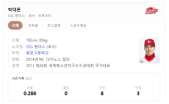 SSG랜더스 포수 박대온 선수는 NC다이노스에서 2차드래프트로 영입된 포수입니다. NC다이노스에서 꾸준히 가능성을 보여주었지만 백업포수로 평가를 받으며 1군무대에서는 자주 모습을 보이지는 못했으며 NC다이노스 김형준 선수의 성장에 따라서 빽업으로 밀리면서 2차 드래프트로 SSG랜더스로 이적을 하였습니다.