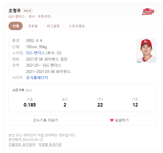 그러니까 결론은 WAR 마이너스만 하지말아라... 정도로 의견을 하나 담아볼까 합니다. 그동안 얼마나 별로였으면 이지영 선수까지 지명권을 태울 정도로 영입을 했고 박대온 선수를 바로 뽑아볼 만큼 급했을까 하는 팀이 바로 SSG랜더스인 만큼 선수들이 잘 해주면서 조형우 선수가 잘 성장해서 자리잡는 모습을 보여주기를 기대해보겠습니다.
